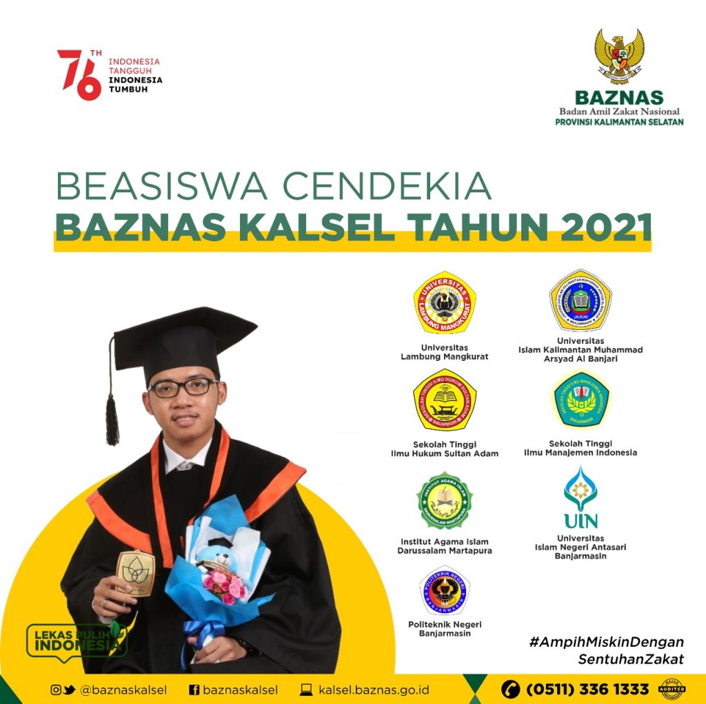 KALSEL.BAZNAS.GO.ID, BANJARMASIN – Di suasana pandemi Covid-19 dan bertepatan dengan Hari Kemerdekaan RI yang Ke-76, BAZNAS Kalsel membuka pendaftaran beasiswa cendekia untuk mahasiswa/i yang terdaftar