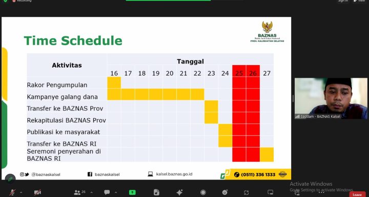 Banjarmasin (16/11/2023) – BAZNAS Provinsi Kalimantan Selatan menyelenggarakan Rapat Koordinasi yang dihadiri oleh BAZNAS Kabupaten dan Kota se- Kalimantan Selatan. Rapat Koordinasi yang dilakukan melalui zoom meeting ini membahas tentang program “Membasuh Luka Palestina” yang merupakan program untuk seluruh BAZNAS di Indonesia.