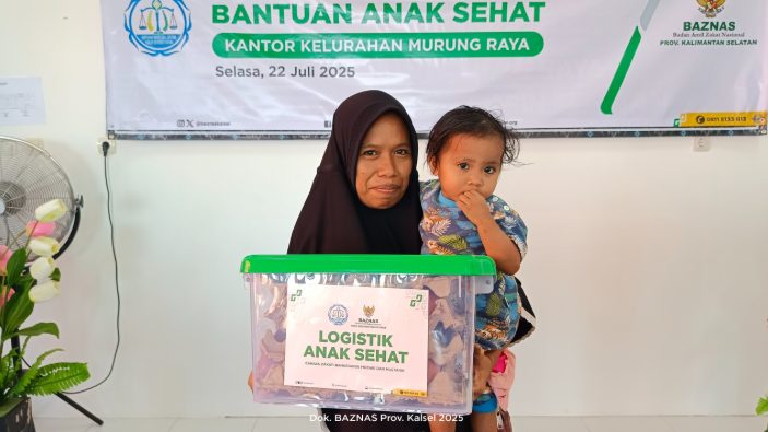 Sebagai bentuk dukungan terhadap peningkatan kualitas kesehatan anak, Badan Amil Zakat Nasional Provinsi Kalimantan Selatan (BAZNAS Kalsel) menyalurkan bantuan logistik gizi untuk anak sehat di Kelurahan Murung Raya, Banjarmasin, Selasa (22/7/2025). Sebanyak 30 anak menerima paket bergizi yang dirancang untuk mendukung tumbuh kembang optimal mereka.