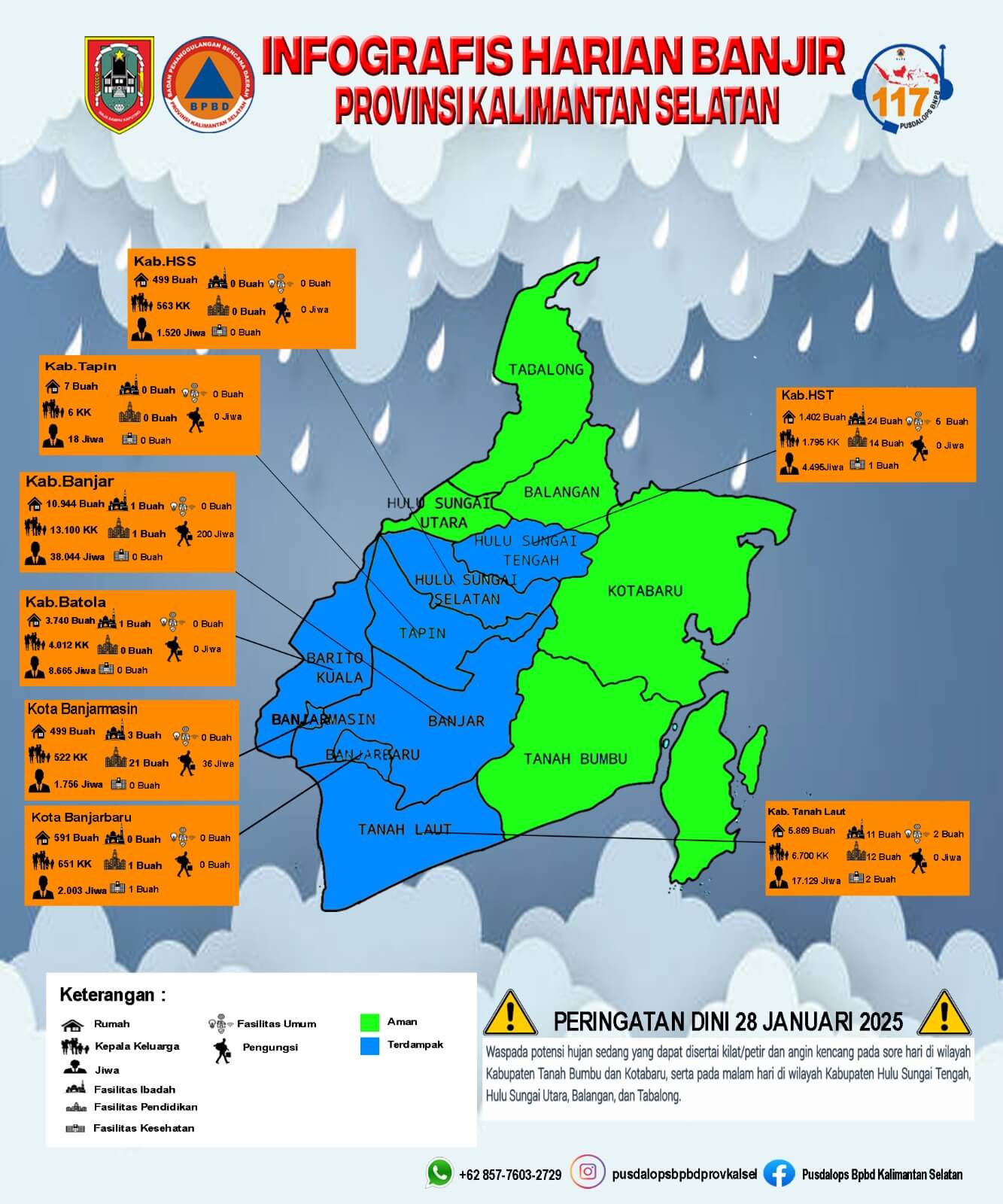 Hasil dari pantauan dari BPBD Provinsi Kalimantan Selatan dan Pusdalops BPBD Provinsi Kalimantan Selatan per tanggal 28 Januari 2025 sebanyak 8 Kabupaten/Kota yang terendam banjir dengan rincian sebagai berikut :